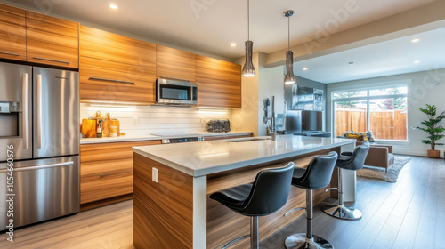 Modern cozy kitchen design featuring sleek wooden cabinetry, stainless steel appliances, and spacious island with bar stools, creating warm and inviting atmosphere