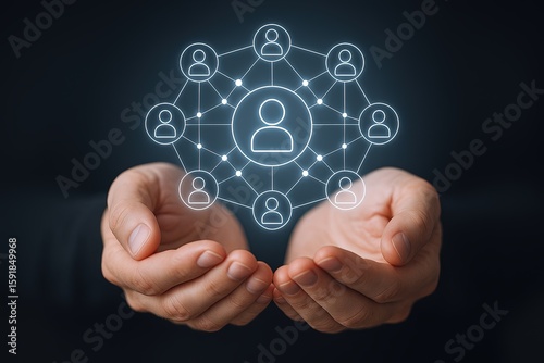 Modern digital network connection with interconnected human icons and central user.