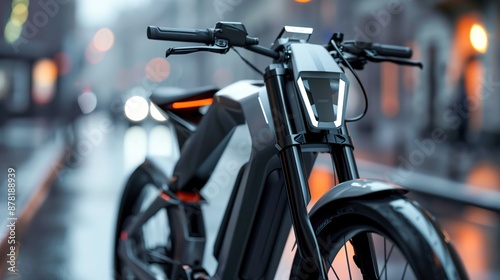 Modern Electric Bicycle Parked on Urban Street Scene with Bokeh Lights