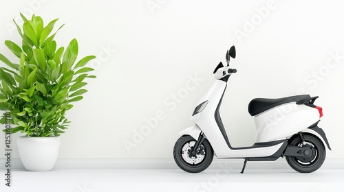 Modern Electric Scooter Parked Beside a Lush Potted Plant in Minimalist Indoor Environment