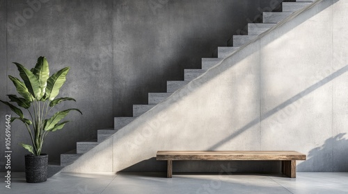 Modern entrance hall interior design featuring a staircase and a rustic wooden bench adjacent to a concrete wall