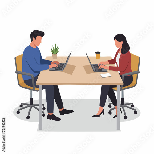 Modern Flat Illustration of Coworking Space with People Working on Laptop