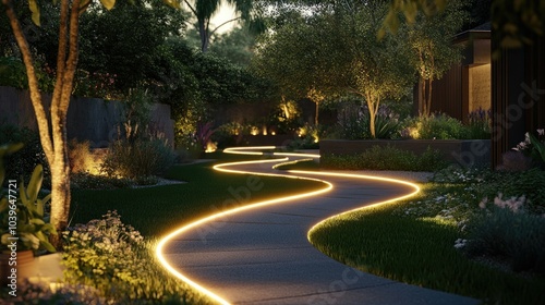 Modern garden path with softly glowing pathway lights at night, curved layout highlighted by subtle, refined lighting.