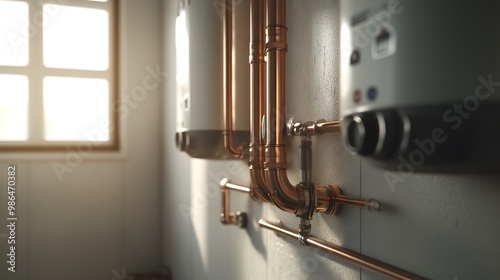 Modern home gas boiler water heater on the wall, copper pipes and white walls, interior of a modern Scandinavian house