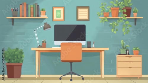 Modern home office interior with desk, computer and plants creating cozy workspace