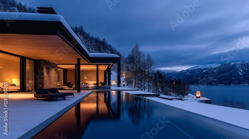 Modern house with infinity pool overlooking snowy mountain lake at dusk