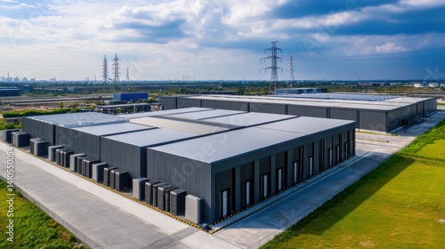 Modern Industrial Warehouse Complex with Solar Panels and Power Lines Under a Dramatic Sky
