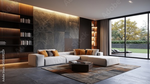 Modern interior design featuring a striking slate accent wall with a refined, textured look.