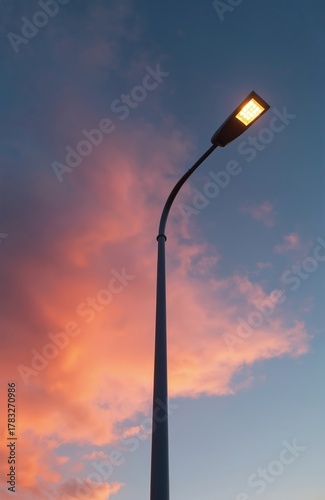 Modern LED street lamp on pole against colorful sunset sky. Dusk illumination lights up, city infrastructure element glows during twilight orange clouds.