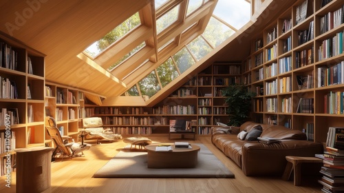 Modern library or bookstore interior with Learning and coworking space,relax zone,Library with rows of bookshelves arranged,school,university,shared desk and chairs,panoramic window.