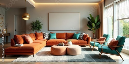 Modern Living Room Design with Orange Sectional Sofa and Teal Armchairs