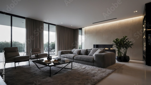 Modern living room featuring a gray sofa, two chairs, a glass coffee table, and large windows with natural light.