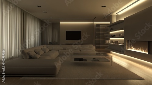 Modern living room featuring a large sofa and fireplace design
