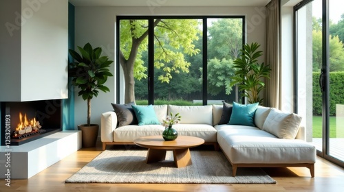 Modern living room interior design with sectional sofa, fireplace, and large windows overlooking lush greenery