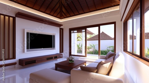 Modern living room interior with wooden accents, large windows, and tropical garden view outside