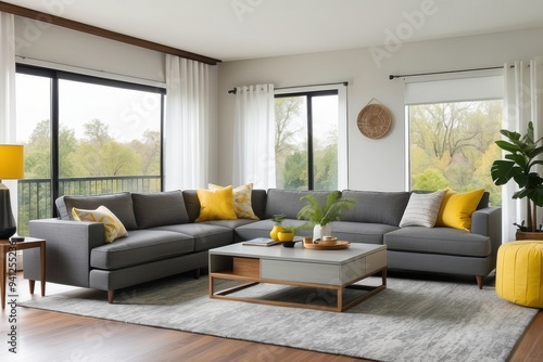 Modern Living Room with Gray Sectional Sofa, Yellow Pillows, and a Coffee Table