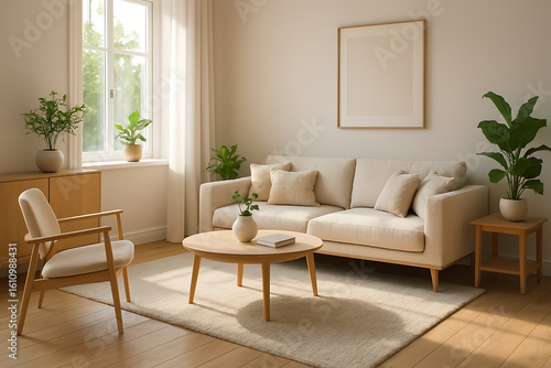 Modern living room with plants and natural light creates relaxing atmosphere for peaceful living