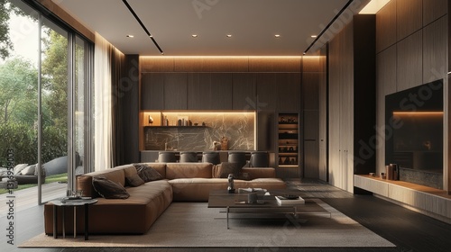 Modern living room with sleek furniture, neutral tones, and soft lighting.