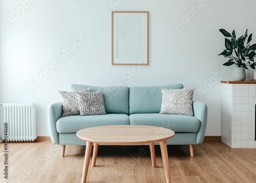 Modern Living Room with Soft Blue Sofa and Cozy Decorative Pillows