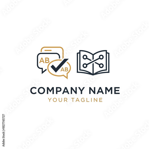 Modern logo design featuring speech bubbles, a checkmark, and an open book with interconnected elements, representing communication and knowledge.