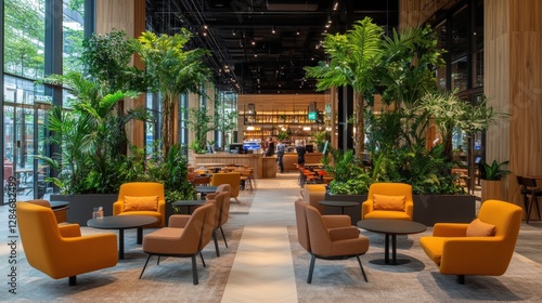 Modern lounge interior with plants and seating in vibrant atmosphere