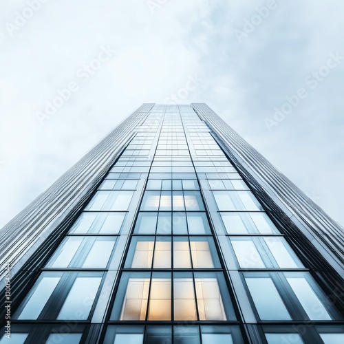 modern minimalist building with grid windows, clean lines, light facade, clear blue sky background, and urban architectural design.