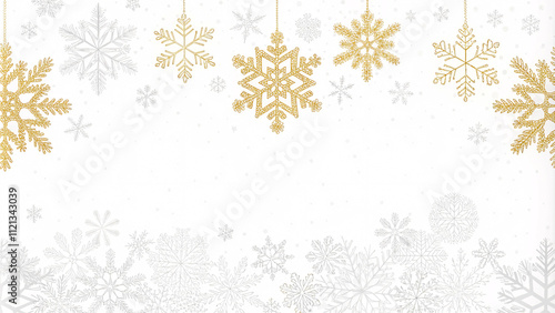 Modern minimalist Christmas background with a clean white backdrop, elegant gold and silver snowflakes scattered across, and subtle glittering textures, perfect for contemporary designs