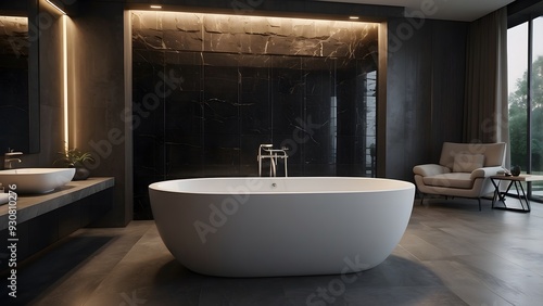 Modern minimalist luxurious bathroom interior design with modern bathtub, elegant classic home decor washroom design