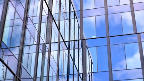 Modern office building with glass facade on a clear sky background. Transparent glass wall of office building.