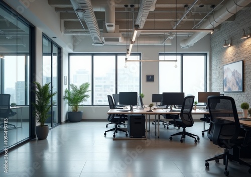 Modern office interior showcasing collaborative workspace with large windows