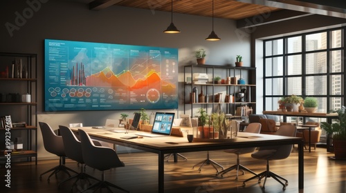 Modern Office Interior with Data Visualization on a Large Screen