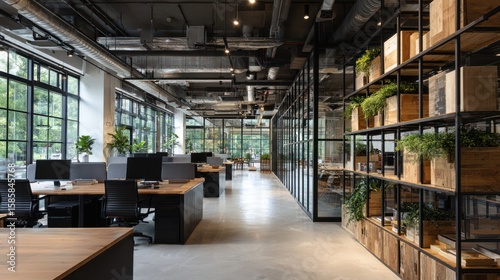 Modern office interior with glass walls, desks, chairs, and a decorative shelving unit