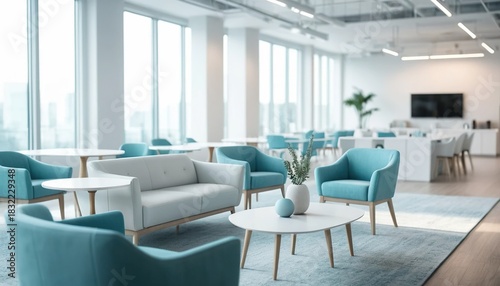 Modern office lounge area with light blue armchairs and white sofa in a bright, minimalist coworking space interior with large windows and natural light