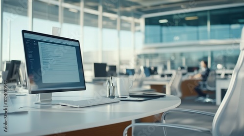 Modern office workspace with computer and minimalistic design, bright and open atmosphere.