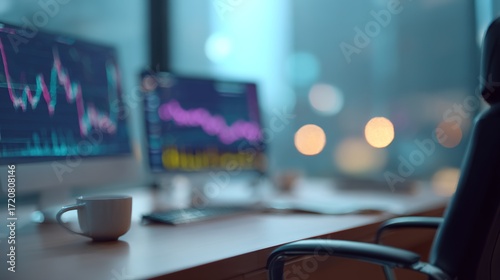 Modern Office Workspace with Computer Screens and Financial Data Display