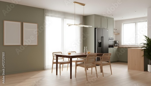 Modern Open Concept Kitchen Dining Area Interior Design Neutral Tones Wood Furniture Stainless Steel Appliances Natural Light Minimalist Decor