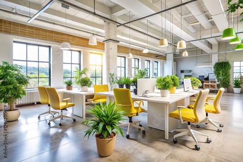 Modern open-plan office bathed in natural light, featuring cheerful yellow seating.