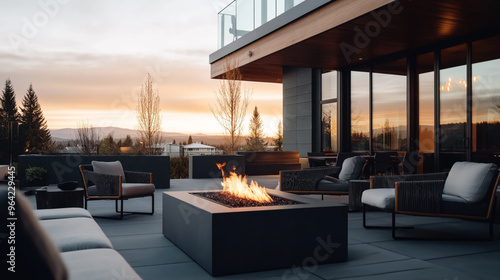 Modern outdoor patio with a sleek fire pit, surrounded by comfortable seating, a wooden ceiling overhang, and glass railings. Scenic sunset with forest and mountainous background.