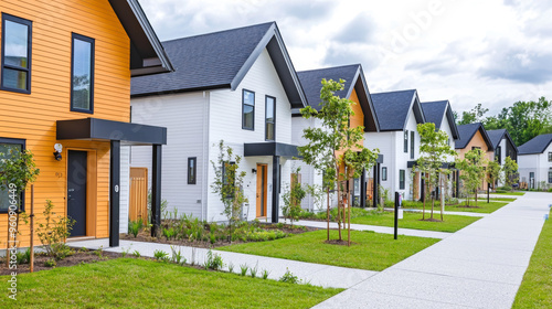 Modern residential neighborhood with stylish homes and vibrant facades on a sunny day