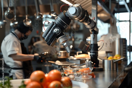 Modern robotic arm in a commercial kitchen assisting in food preparation with a chef in the background. Advanced technology in culinary arts.