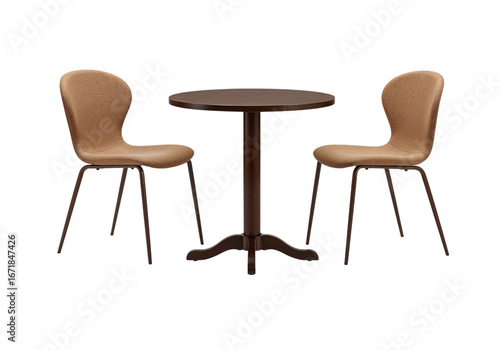 Modern round wooden table with two matching chairs isolated on transparent background for cafe interior design, restaurant furniture, and home decor.