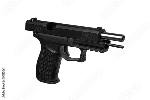Modern semi-automatic pistol. A short-barreled weapon for self-defense. Arming the police, special units and the army. Isolate on a white back