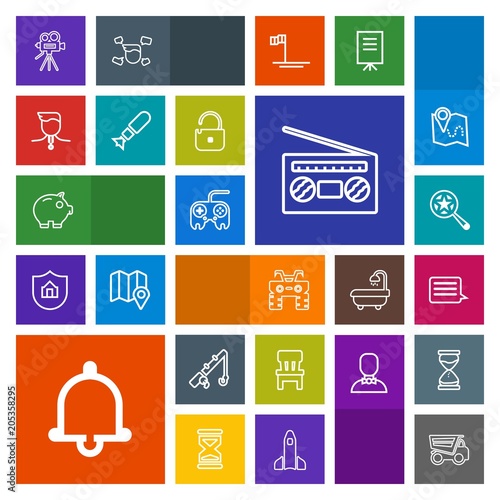 Modern, simple, colorful vector icon set with fishing, find, record, bank, movie, search, dump, alert, economy, chair, audio, wheel, message, quad, fish, alarm, atv, home, music, arrow, reel icons
