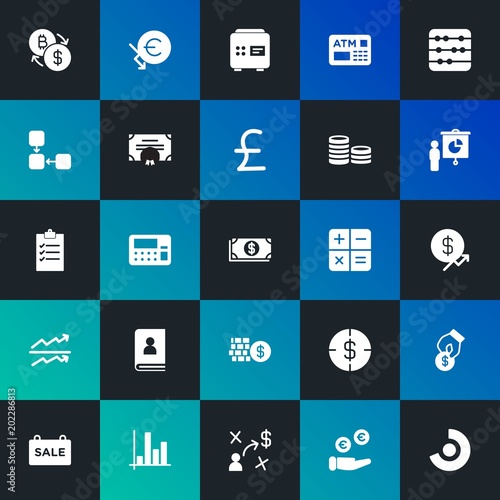 Modern Simple Set of business, money, charts Vector fill Icons. Contains such Icons as financial, machine, award, atm, money and more on dark and gradient background. Fully Editable. Pixel Perfect.