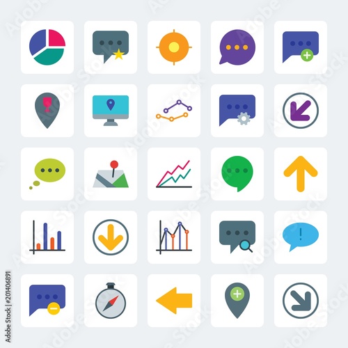 Modern Simple Set of location, arrows, charts, chat and messenger Vector flat Icons. .Contains such Icons as alert, exposure, north, error and more on gray background. Fully Editable. Pixel Perfect