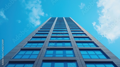 Modern Skyscraper with Glass Windows Against Bright Blue Sky and Fluffy Clouds Above