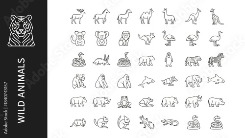 Modern vector outline icons of various wild animals, a sleek and solid graphic collection for nature themes, educational content, and digital design projects