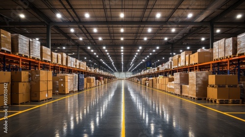 Modern Warehouse Interior with Stacked Boxes and Pallets Under Bright Industrial Lighting in a Spacious Storage Facility
