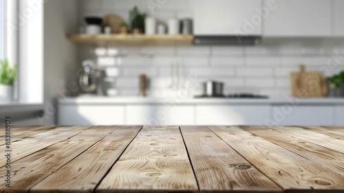 Modern white kitchen with blurred background, wooden table in front, stylish decor