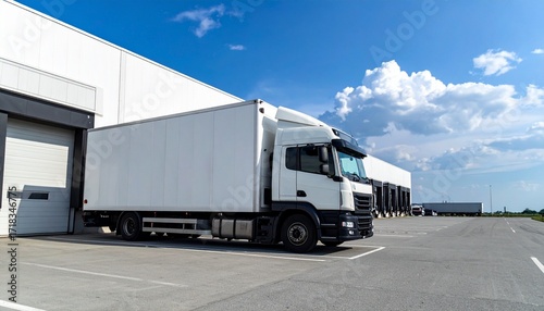 Modern white semi-truck with streamlined cab and enclosed trailer parked on concrete outside an industrial warehouse, under a clear sky with wispy clouds.